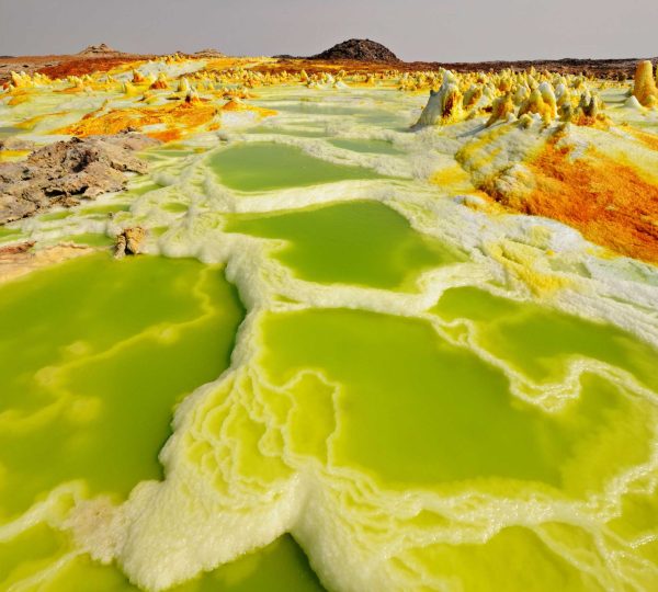 Early morning visit to the incredible Dallol area, one of the hottest and lowest places on Earth. Explore bright sulfur fields, acid pools, and salt chimneys. Watch Afar salt miners and camel caravans in action. After lunch, drive back to Semera for your evening flight to Addis Ababa. End of tour.